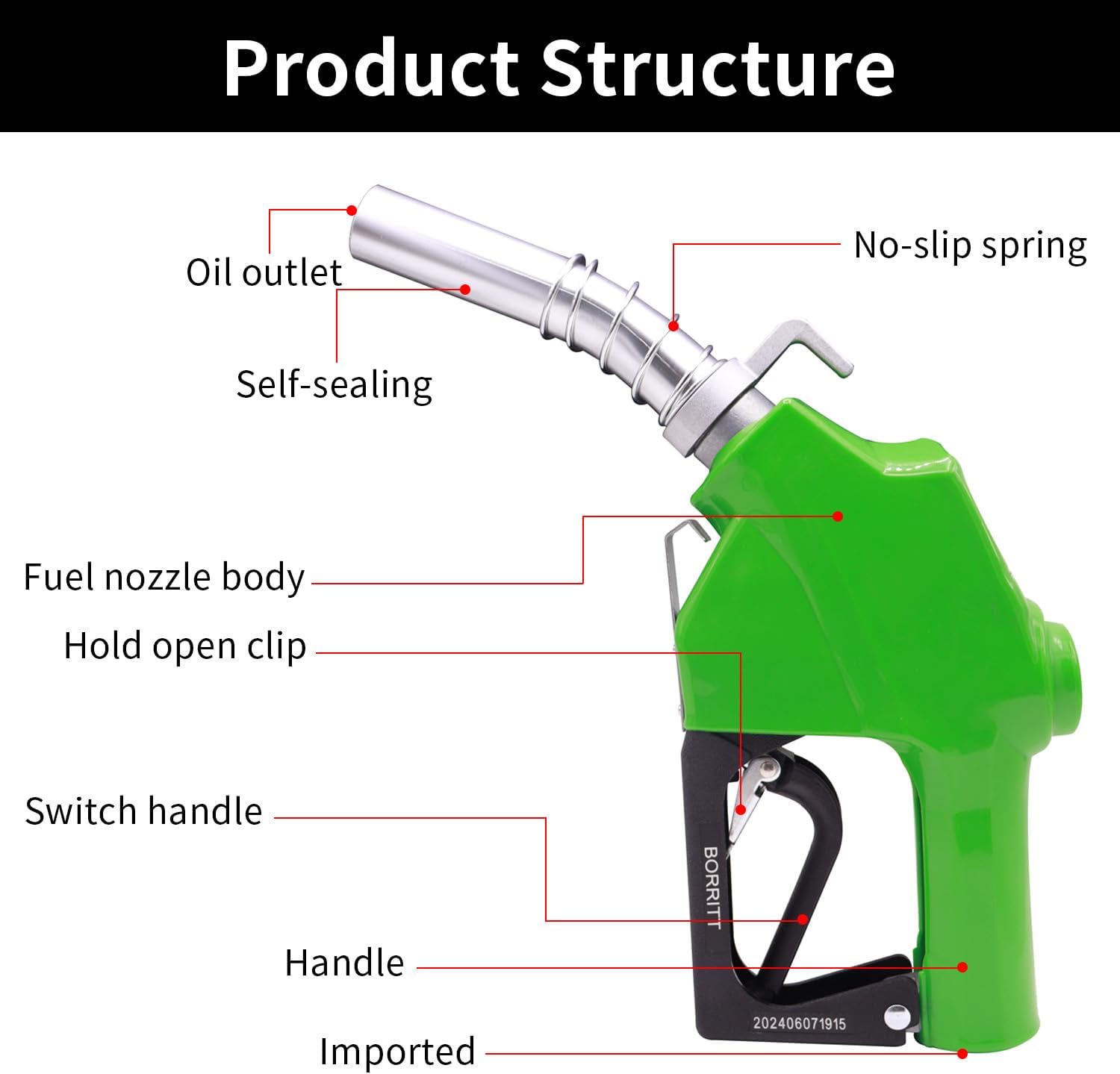 This is BORRITT automatic fuel filling nozzle , which is used in gas stations, aeronautics, agricultural fields, transportation companies, oil industry, chemical and other commercial areas. Internal thread NPT standard.This automatic fuel nozzle is compatible with most 1 inch hose swivel. The fuel nozzle has the following features: It can connect 12V, 24V 110V pumps. 1 inches threaded inlet and 1inches outlet. PVC cover to prevent hand contact with aluminum and corrosion. It features an ergonomic and easy-control handle. It’s easy to handle and easy to use.The 1 inches auto shut-off fuel nozzle has a sensor at the tip so when the tank is full, the sensor is automatically activated. It has 3-notch hold open clip for when you want to let the fuel nozzle fill the tank without holding down the trigger, preventing the hand from getting tired. This automatic fuel nozzle is making it worthy of ownership and trust, you can feel confident adding it to your cart! Specification Color: Green Material: Aluminum alloy +Zinc alloy+PVC Overall size: 15.76"Lx 7.72"W x 2.44"H(Irregular shape) Net weight: approx 3.4 Lbs Inlet dimension: 1" Diameter of Spout: approx 1" Flow rate: 0-32GPM Working Pressure: 50PSI (3.5 Bar) Suitable for medium: Diesel, gasoline, kerosene Size: 1" Temperature range :-25 °C to +65 °C Package included: 1 x Automatic Fuel Nozzle with hook