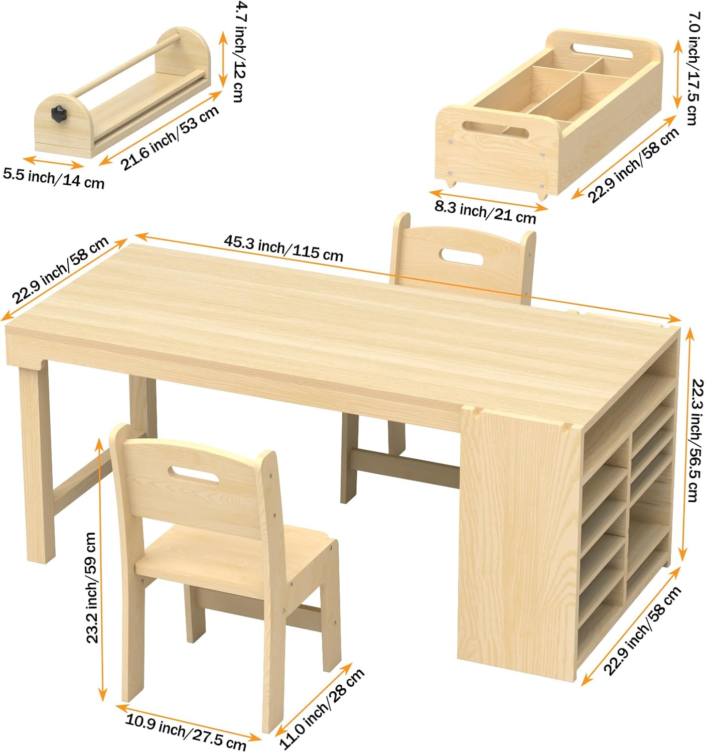 Why Choose Wooden Kids' Art Table and Chair Set? This all-purpose art set is perfect for both indoor playrooms and outdoor use in the backyard. Ideal for arts and crafts, pretend play, dining, and much more, this kids’ activity table encourages creativity in various activities. Designed at the perfect size, this craft table enhances your little one’s creativity and fine motor skills, providing them with the space they need to grow. The table comes with two storage cabinets, offering ample space to store markers, crayons, pencils, and other art supplies. A perfect gift to help your child explore, learn, and develop early reading skills. The durable, smooth surface is easy to clean, and the quick assembly process ensures setup is a breeze. This versatile art desk and chair set is ideal for home use, school projects, or classrooms, providing a functional and stylish solution that fosters creativity in children. Specification: Material: Rubber Wood Color: Oak Table Dimensions: 45.3” (W) x 22.9” (D) x 22.3” (H), Table Height: 22.3" Chair Dimensions: 12.6” (W) x 15” (D) x 24.4” (H), Seat Height: 12.2"" Package Includes: 1 Table, 2 Chairs, 1 Instruction Manual, 1 Hardware Pack