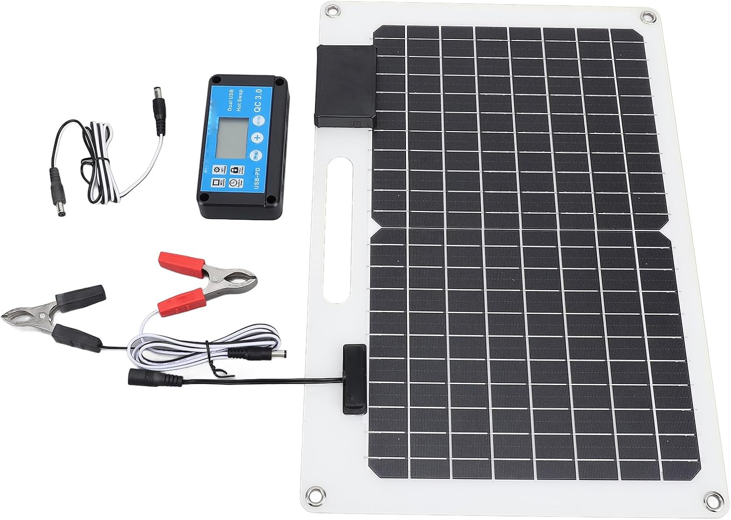 1. [EFFICIENT CHARGING]: Maximize charging efficiency with the monocrystalline silicon solar panel that delivers 100W output for quick and reliable power replenishment. 2. [ADVANCED CONTROLLER]: from the 100A controller's stability and complete charging management, ensuring the safety and performance of your 12V 24V system. 3. [FULL PROTECTION]: your battery from overcharging, overvoltage, discharge, and short circuits with the solar controller's comprehensive protection features. 4. [DUAL USB PORTS]: Stay connected on-the-go with dual USB ports that enable simultaneous charging of phones and devices for increased productivity. 5. [MULTI-USE APPLICATION]: Ideal for RVs, security cameras, and various flat surfaces, this solar panel and controller kit offers a practical and versatile power solution for different environments. Specification: Item Type: Solar Panel Charger Solar Panel Power: 100W (no power storage function) Solar Panel Size: Approx. 41 x 28cm / 16.1 x 11in Output Voltage: 12V 24V Controller: 100A Weight: Approx. 608g / 21.4oz How to Use: Place the solar panel under sunlight to use. Package List: 1 x Solar Panel 1 x Controller 1 x Clamp 1 x Connecting Cable
