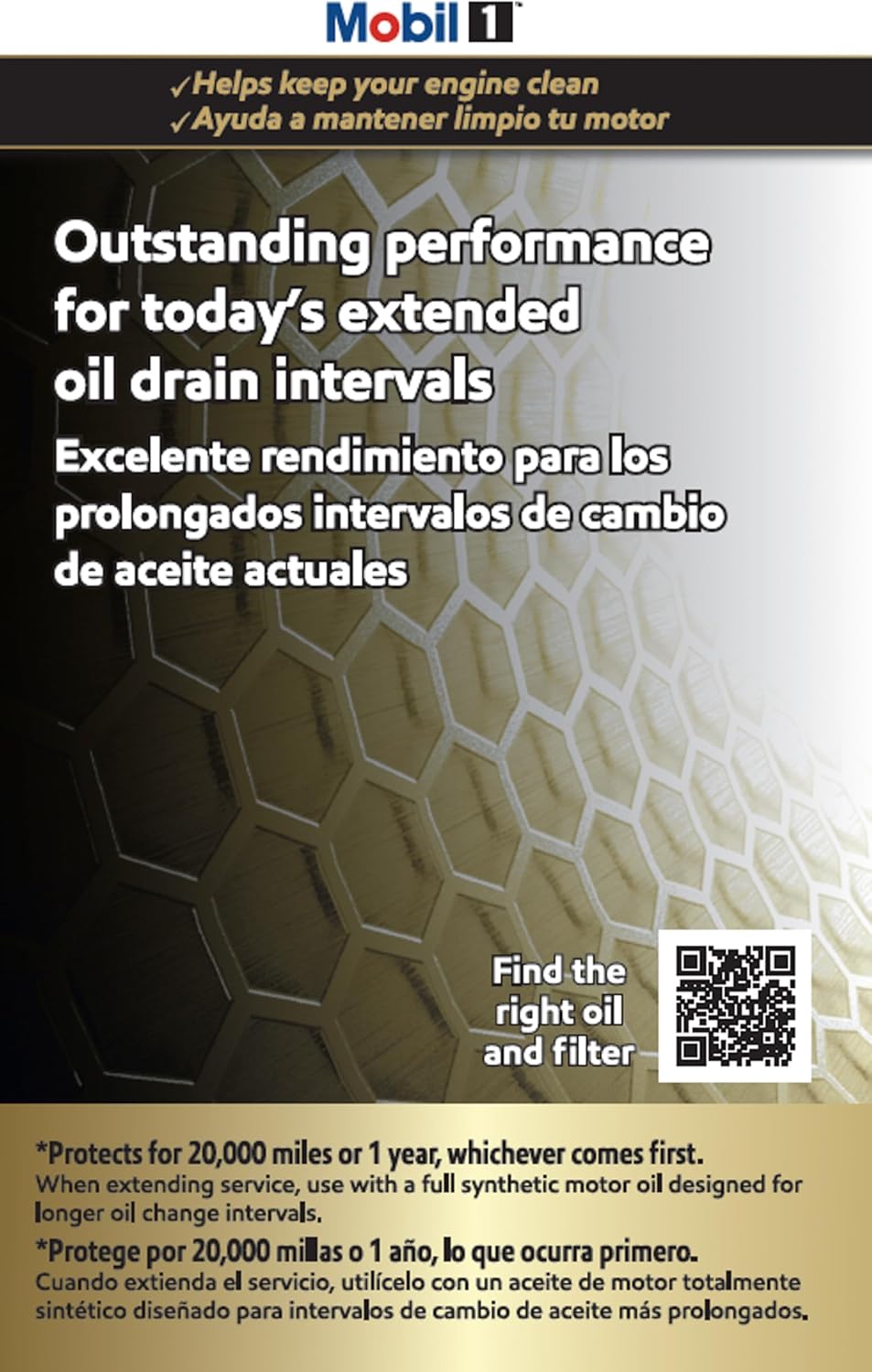 | Manufacturer Warranty Description | 1 Year or 20,000 Miles, Warranty‑backed under the Mobil 1 Extended Performance Oil Filter Limited Warranty (see manufacturer details). |