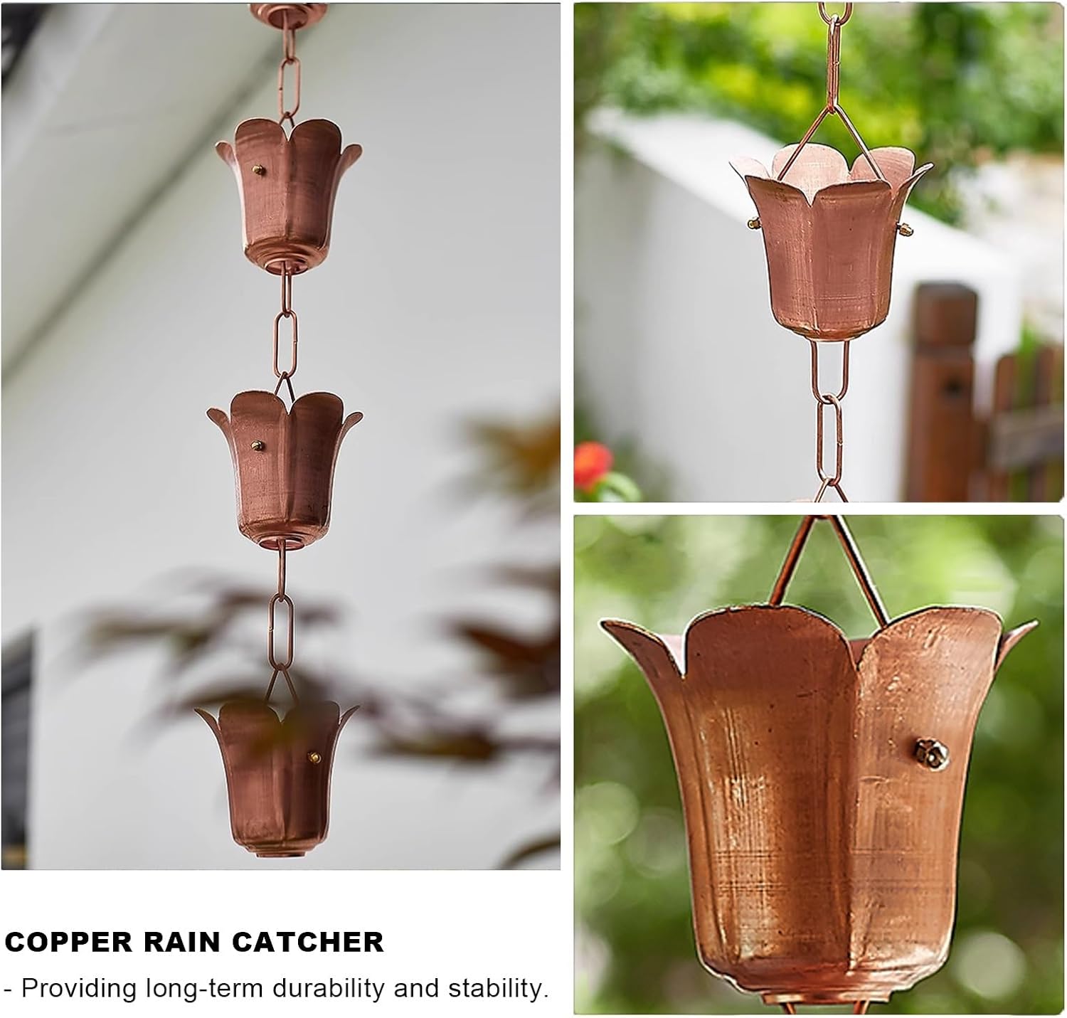 Are you still looking for a unique way to upgrade your home decor?Then this rain chain from us will be an elegant alternative to your ugly downspouts!【 Package Contents 】1 × Rain Chain 【 Specification 】- Material: Copper- Cup Numbers: 5/m - Chains Length: 1 m /1.5 m/2 m/2.4 m/2.6 m/3 m/3.6 m, (3.3ft/5ft/6.5ft/8ft/8.5ft/10ft/12ft)- Customizable: Yes【 Feature 】- Directs the flow of rainwater.- Can replace traditional downspouts.- Makes a great holiday gift for friends.- Provides long-term durability and stability.- Decorative for gazebos, garden sheds, temples and patios.- Can drain into the ground, watering cans, planters, rain barrels or basin bowls.【 Kind Reminder 】- There may be some splashing.- Please clean the gutter before installation.- Minor errors can occur due to different batches and manual measurements. Thank you for your understanding.- There may be some differences between the image and the product due to display and lighting reasons, please refer to the actual product.【 Satisfactory Service 】- We provide with you are the best trusted service. Any questions, please do not hesitate to contact us, we will serve you 24 hours.
