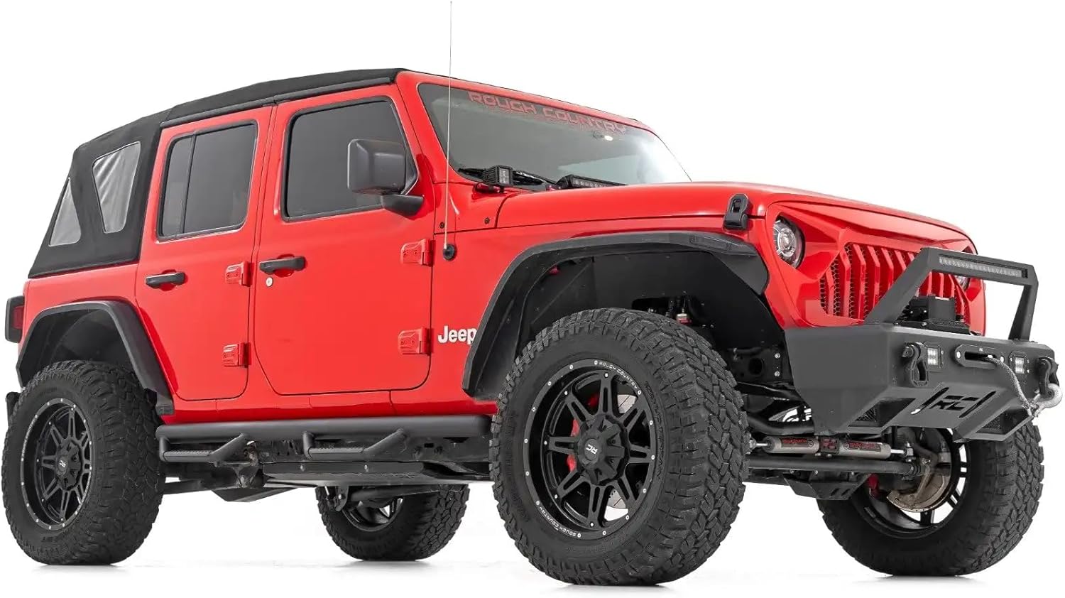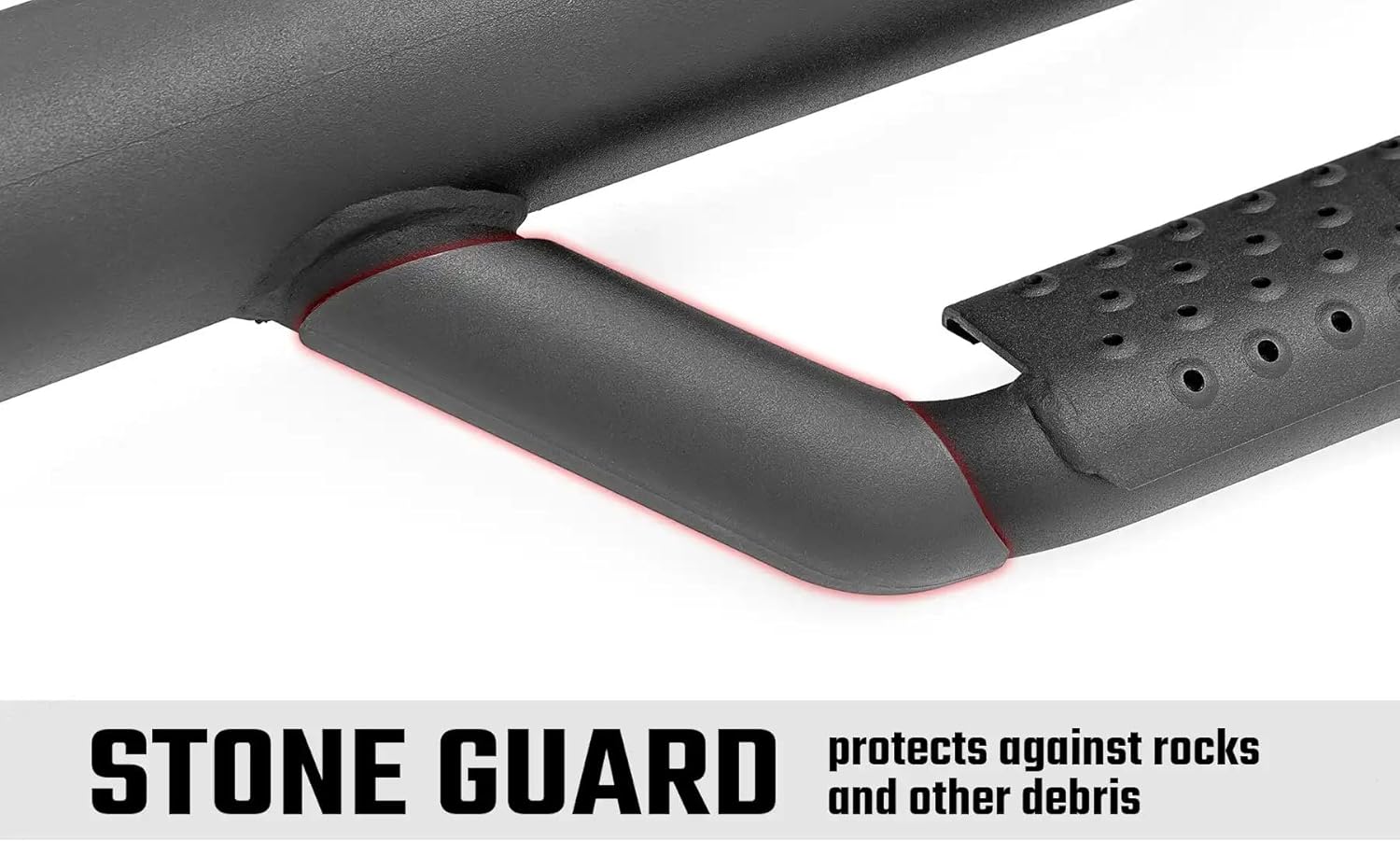 Climbing into your Wrangler should never feel like a workout. With Rough Country's all-new bolt-on Nerf Steps, getting in and out is a breeze. Experience effortless access and elevate your Wrangler with a sleek, durable upgrade. Enhanced Undercarriage Protection: Say goodbye to road debris, rocks, and obstacles that could damage your undercarriage. Our Nerf Steps act as a shield, protecting your vehicle from the harsh elements below. Integrated Stone Guards for Added Protection: Keep your Wrangler looking like new. The built-in stone guards effectively deflect kicked-up rocks and debris, preserving your vehicle’s paint job from potential damage.Sleek, Streamlined Design: No bulky bars here, just a clean, high and tight profile that follows your cab’s contours. These Nerf Steps provide a polished, streamlined look that enhances your Wrangler’s rugged yet refined style. Built to Endure: Crafted from .084 wall, corrosion-resistant tubing, these Nerf Steps are engineered to withstand anything the road or trail throws at them. From muddy trails to harsh environments, they’ll handle it all while staying tough and reliable. Quick and Easy Installation: No drilling required, just bolt them on and enjoy a hassle-free installation. Spend less time working and more time exploring with this straightforward, user-friendly design. Limited Lifetime Protection: Backed by Rough Country's lifetime warranty against material and workmanship failures - including welds, brackets, and structural components (finish covered by a 1-year warranty). Step up your Wrangler’s style and protection with Rough Country Nerf Steps.